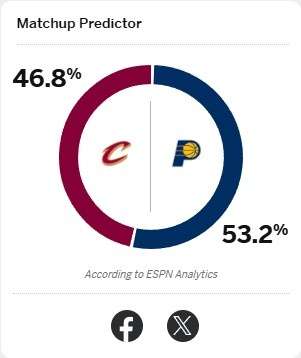 今天,ESPN预测本场比赛胜率,步行者53.2%略占优势,骑士46.8%。