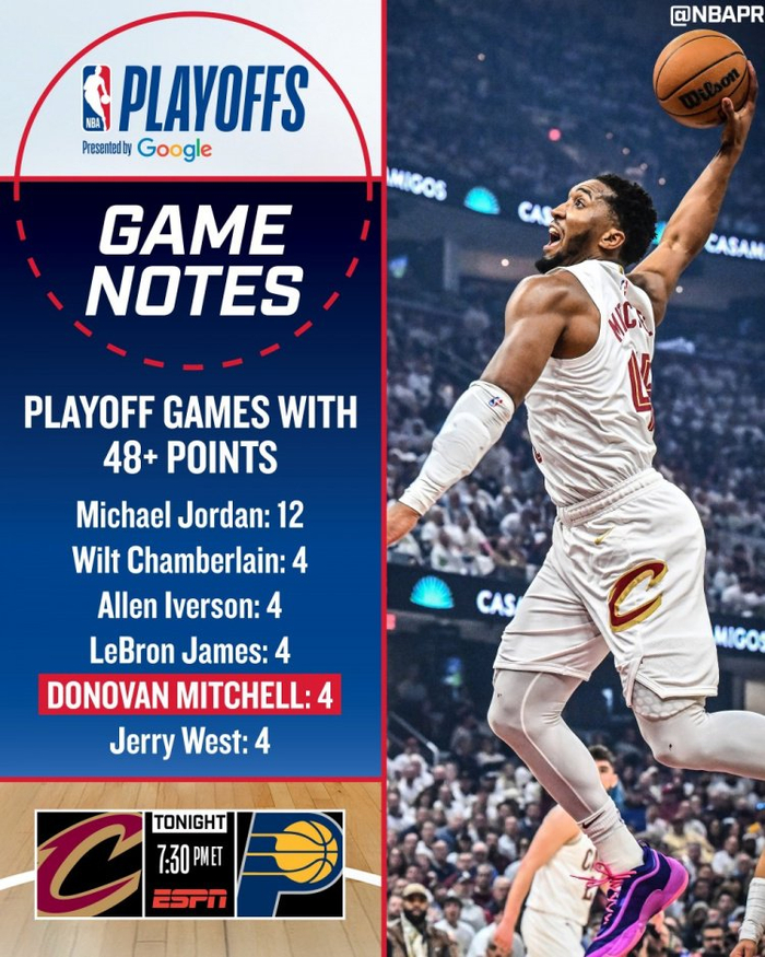 据统计,这是米切尔生涯第4次在季后赛单场砍下至少48分,与詹姆斯、艾弗森、杰力-韦斯特、张伯伦并列历史第二,仅次于乔丹(12次)。