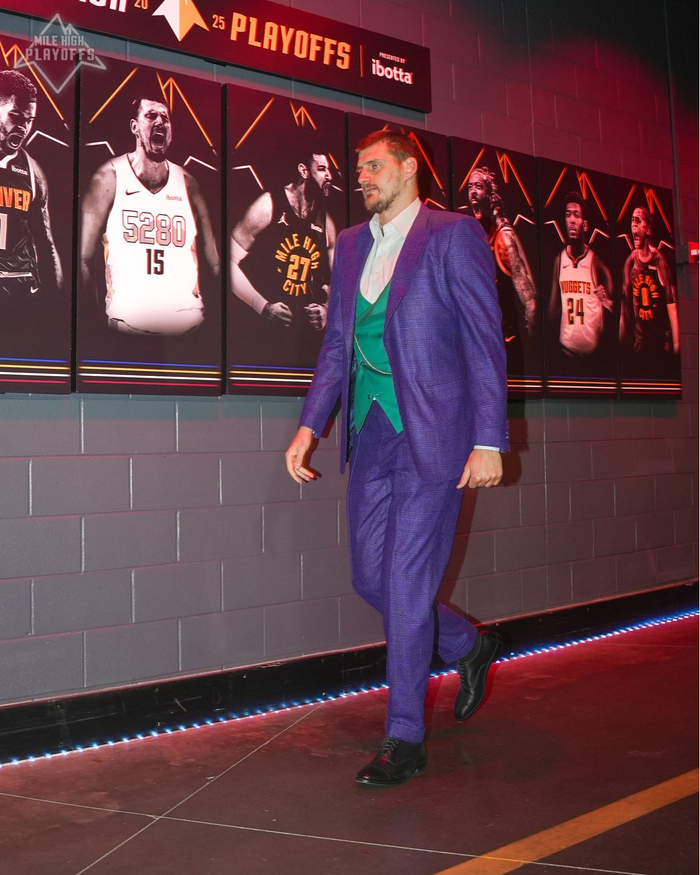 直播吧05月10日讯 今日NBA季后赛雷霆(1)VS掘金(1)G3,将在今早10:00打响。赛前,掘金官方发布了约基奇的入场穿搭,配文:“为什么这么严肃?”