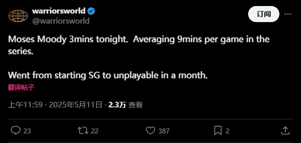勇媒发推惊叹:“一个月不到,穆迪从首发得分后卫沦落到被弃用。”