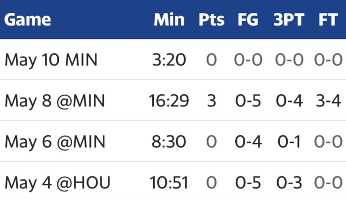 此役,勇士球员穆迪仅出战3分20秒,全部数据为0,正负值-7。