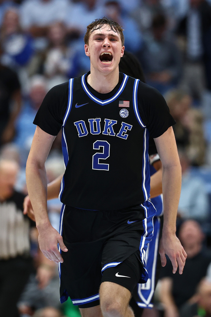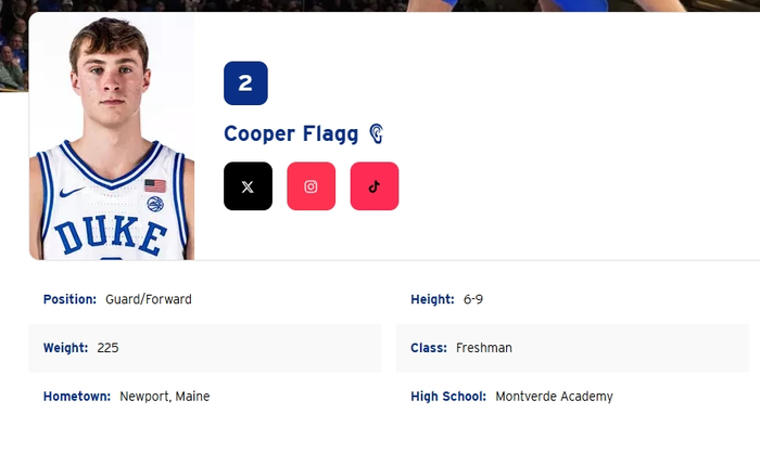 弗拉格现年18岁,身高2米06,体重102公斤,司职前锋;大一赛季,弗拉格带领杜克取得35胜4负的战绩,疯狂三月杀进了半决赛。2024-25赛季,弗拉格场均拿下19.2分7.5篮板4.2助攻1.4抢断1.4盖帽,6项数据皆为全队最高。