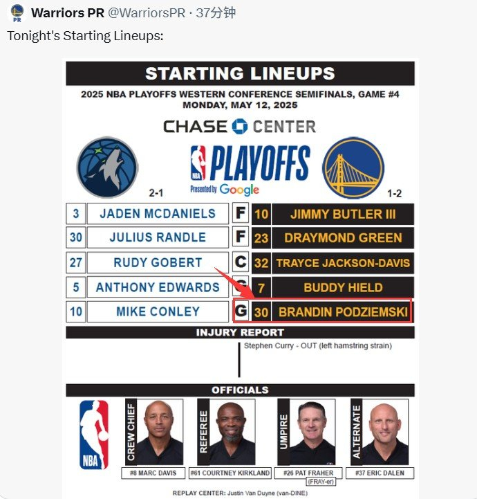 迷惑对手😅?勇士官方公布G4首发 错将波姐2号写成了库里的30号