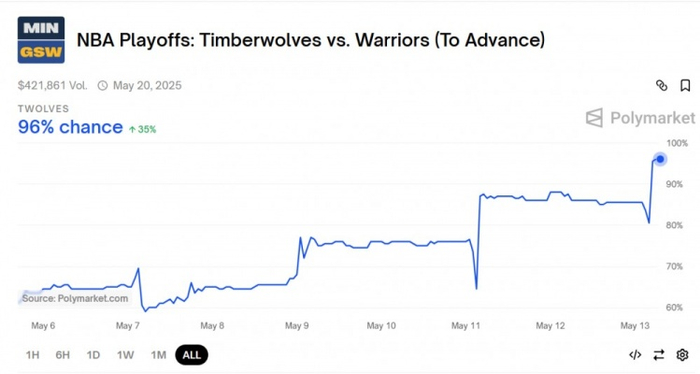 据数据媒体Polymarket Hoops实时统计,目前森林狼拿下本轮系列赛的概率高达96%!
