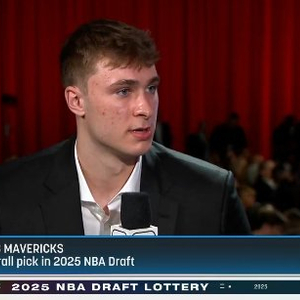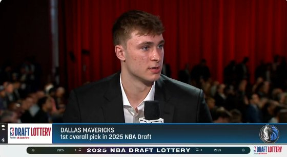 直播吧05月13日讯 NBA乐透抽签仪式今天在芝加哥进行,独行侠最终以1.8%的概率抽中了状元签。在现场观看抽签仪式的2025年状元大热弗拉格接受了节目主持团的采访。