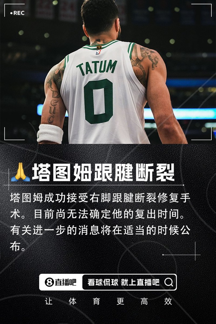 官方:塔图姆成功接受右脚跟腱断裂修复手术 尚无法确定复出时间