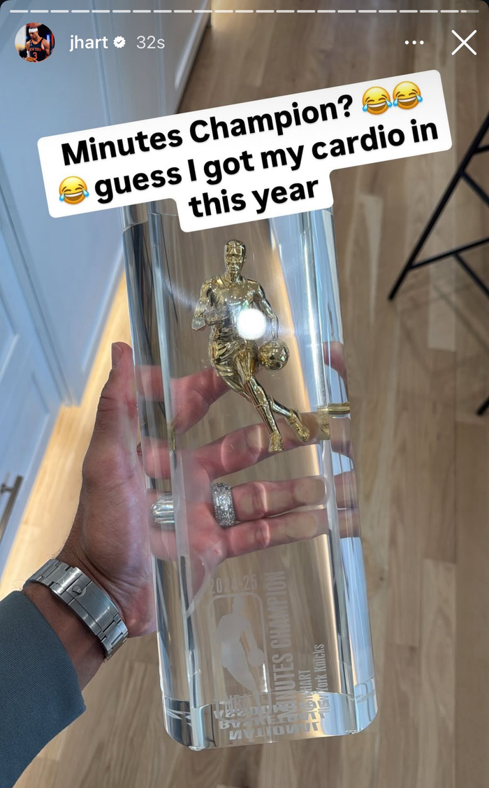 直播吧05月14日讯 尼克斯前锋哈特今日更新社媒,晒出了联盟寄给他的一个奖杯——时长冠军。