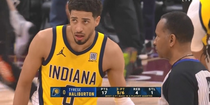 据统计,哈利伯顿单节命中5记三分,创步行者季后赛队史单节纪录,差一记追平NBA历史季后赛单节三分命中数纪录。