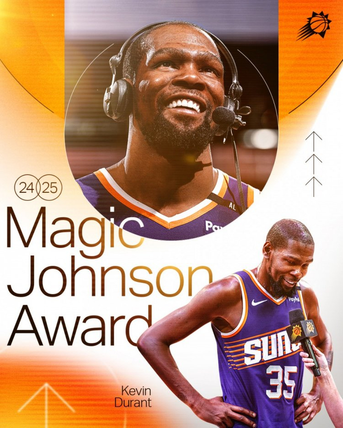杜兰特荣获2024-25赛季魔术师奖 表彰球场出色且与媒体合作良好