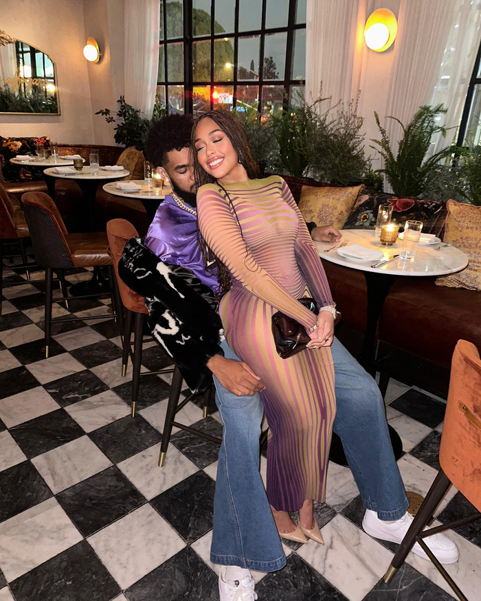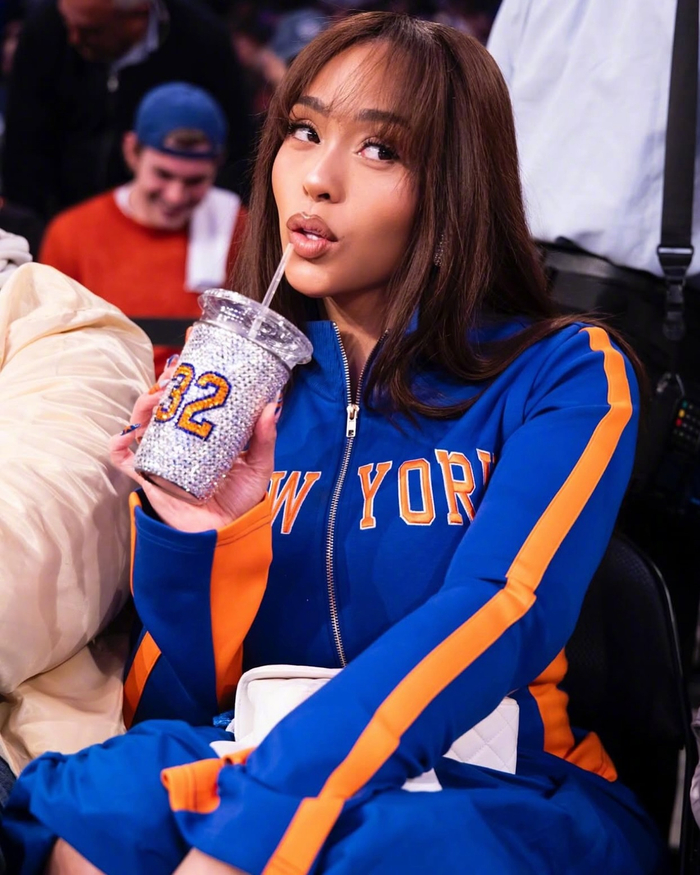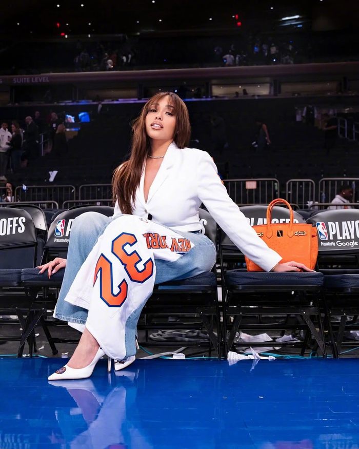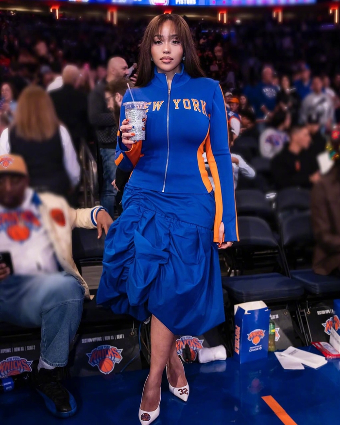 唐斯的女友Jordyn Woods经常到比赛现场为唐斯助威,而细看发现,她每次穿着的单品都是尼克斯主题,其中还包括好多DIY的单品。DIY的牛仔裤、运动服、水杯、甚至是高跟鞋都有唐斯的球衣号码。
