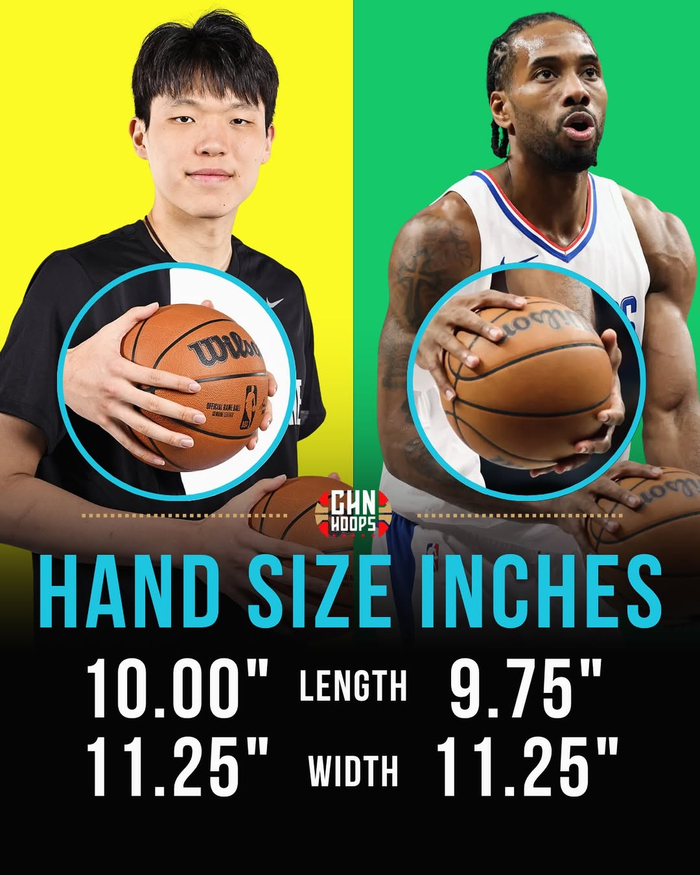 杨瀚森手长是10英寸(约25.4厘米),小卡手长为9.75英寸(约24.765厘米);
