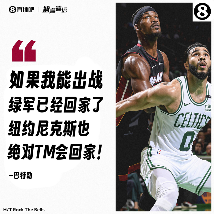 值得一提的是,去年巴特勒在热火时因伤缺席了对凯尔特人的首轮比赛,热火1-4不敌对手出局。在一则视频中巴特勒喊话绿军和尼克斯:“如果我能出战,波士顿现在已经回家了,(东决)纽约也绝对TM会回家。”