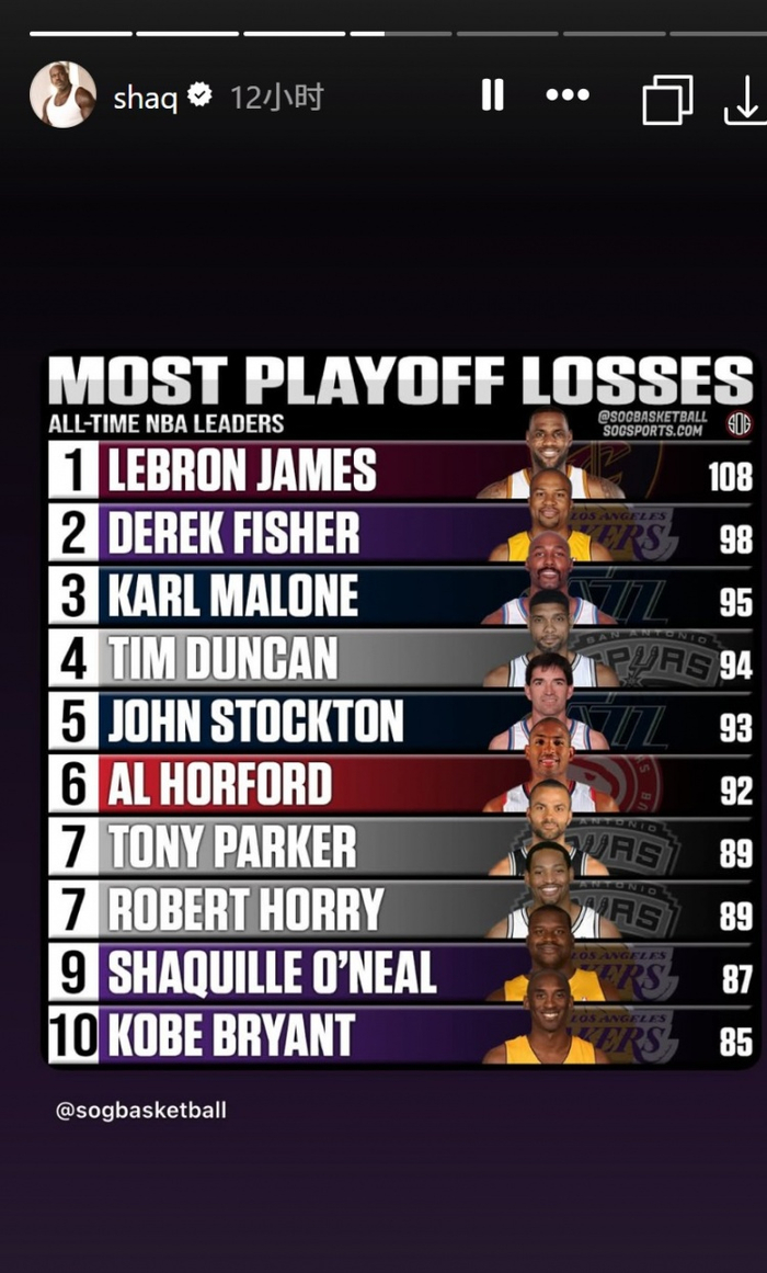 👀奥尼尔转发历史季后赛输球榜前十:詹姆斯108负最多 OK在列