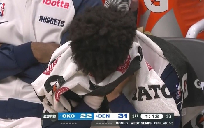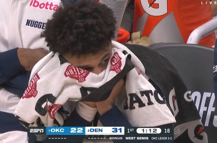 😣看起来有些难受!流感的贾马尔-穆雷替补席毛巾捂住面部