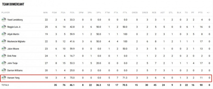 本场比赛杨瀚森继续表现惊艳,他出战18分钟,4投3中,7罚5中,拿到11分6篮板6助攻1封盖的全面数据,其中前场篮板有3个,出现3次失误。
