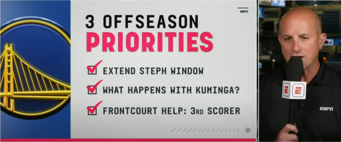 直播吧05月16日讯 薪资专家在今日的《NBA Today》节目中谈到了勇士今年休赛期的三大要务。