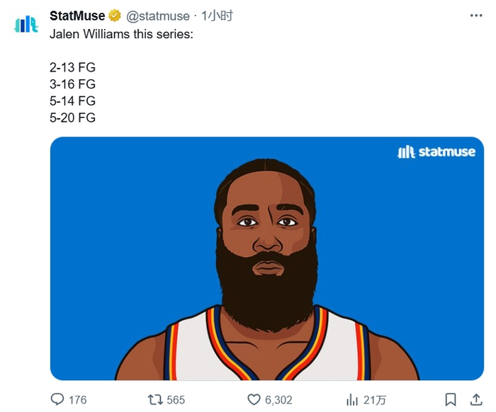 本场比赛,杰伦威16投3中,美媒Statmuse晒出了他本轮的拉胯数据:13中2、16中3、14中5、20中5,但配图应该是错了,配的是哈登。