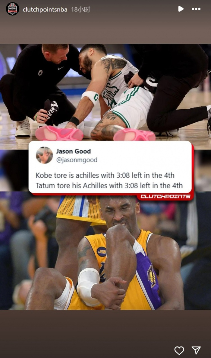 这么巧合吗😲?塔图姆和科比皆在末节剩余3分8秒时跟腱断裂