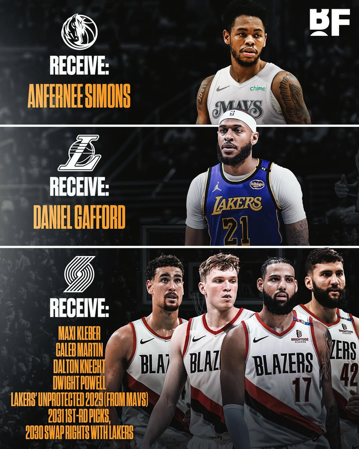 开拓者得到:克莱伯、凯莱布-马丁、克内克特、德怀特-鲍威尔、湖人2029年不受保护的首轮签(来自独行侠,湖人在东契奇和浓眉交易中送出的)、2031年首轮签、2030年首轮签互换权(来自湖人)。