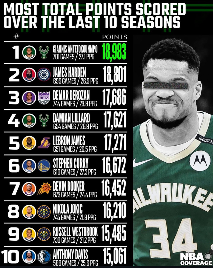 近十年得分榜:字母哥压哈登第1 詹姆斯第5 库里第6 前十无KD