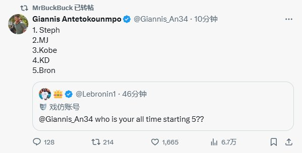阿德托昆博:“斯蒂芬-库里、迈克尔-乔丹、科比-布莱恩特、凯文-杜兰特、勒布朗-詹姆斯。”