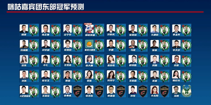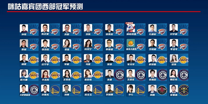 咪咕嘉宾团季前赛开始前的总冠军预测,目前仅剩苏群、孙悦等8位雷霆支持者。