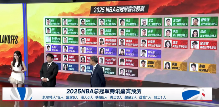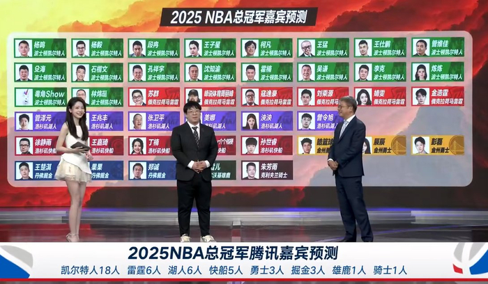 🐧体育43位解说嘉宾/主播,在季后赛完整对阵出炉后,再次进行了总冠军预测——包括杨毅、王猛在内的18人选择绿军;苏群等6人支持雷霆;管泽元、张卫平、美娜等6人支持湖人;徐静雨、丁楠等5人支持快船;另外还有3人支持掘金、3人支持勇士、1人支持雄鹿、1人支持骑士。