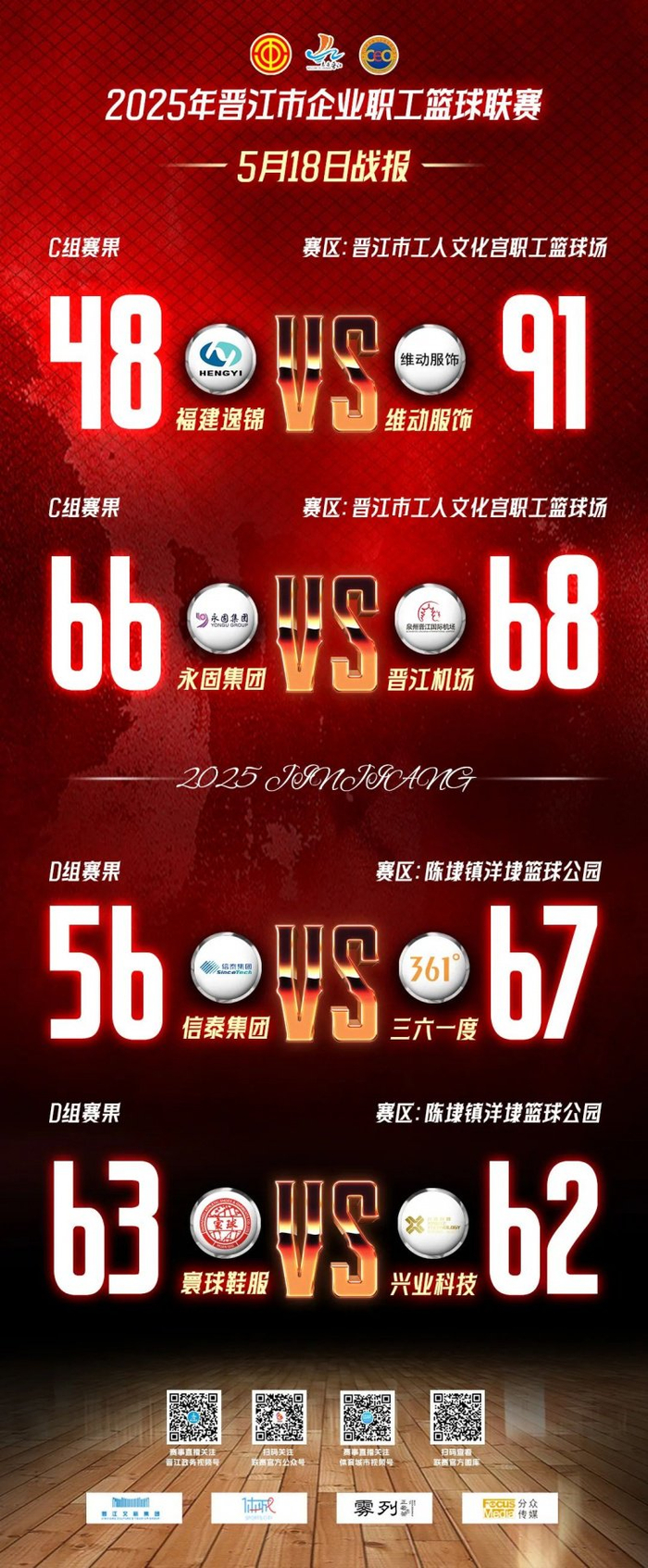 5月18日晚19:40,2025年晋江市企业职工篮球联赛(简称“#晋江企BA ”)C、D组第一阶段小组赛在晋江市工人文化宫职工篮球场和陈埭镇洋埭篮球公园继续第四个比赛日的精彩对决。