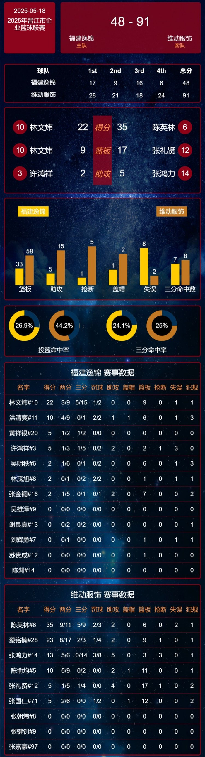 5月18日晚,C组晋江市工人文化宫赛区首场比赛由福建逸锦对阵维动服饰。维动服饰6号陈英林全场砍下35分,帮助球队以91:48的比分大胜福建逸锦。