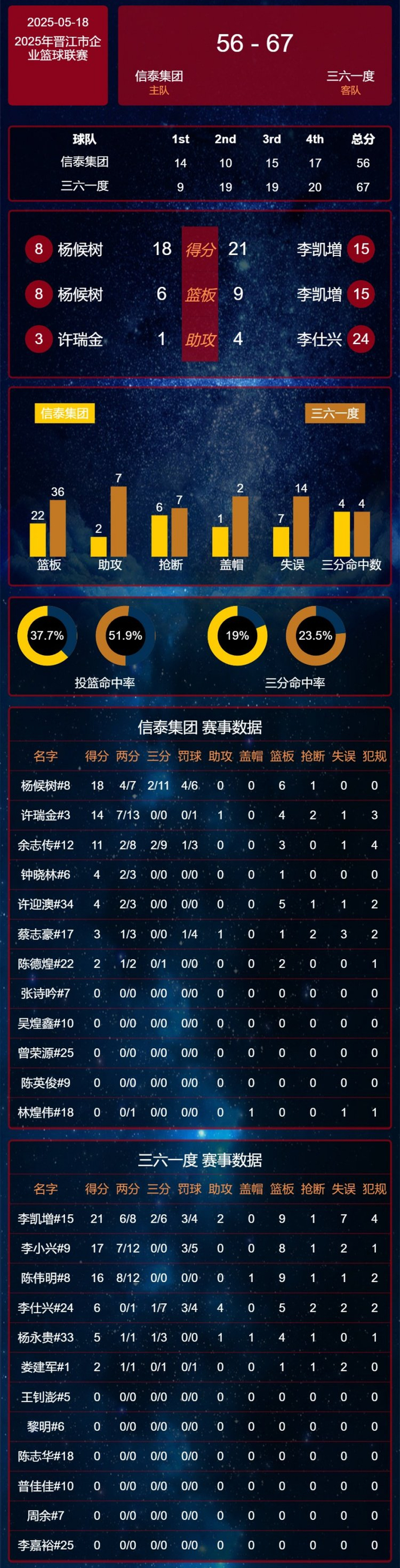 末节决战,信泰集团展开绝地反击。杨候树连续命中高难度进球,一度将分差缩小至个位数。关键时刻,李凯增再次挺身而出,他先是命中一记稳定军心的中投,随后又利用罚球锁定胜局。最终,三六一度以67:56守住胜利,李凯增全场砍下21分2助攻,而杨候树空砍18分成为孤胆英雄。