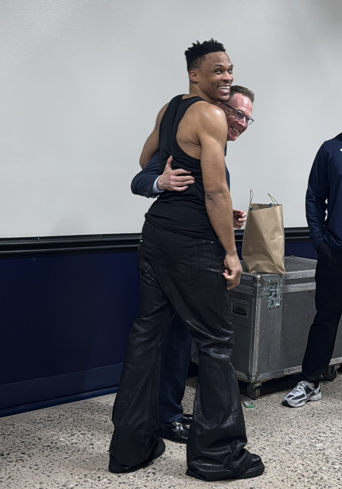 赛后,雷霆GM普雷斯蒂特意在客队更衣室前等待前雷霆球员拉塞尔-威斯布鲁克。待威少换好衣服离开更衣室后,两人拥抱大笑,交谈甚欢。