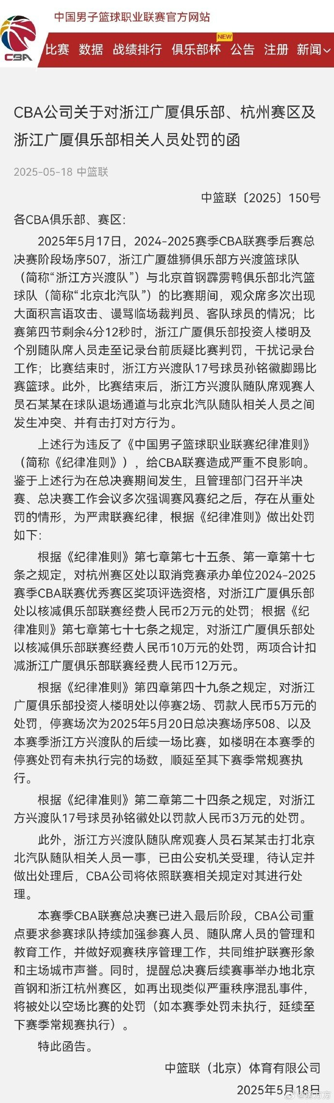 😡罚!官方:扣减广厦经费12万&楼明罚5万停赛2场&孙铭徽罚3万