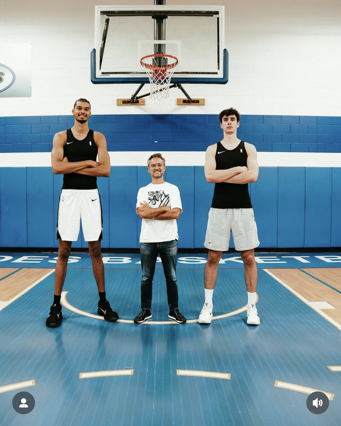 文班和Maxime Raynaud一同训练,后者是今年参选的新秀中锋