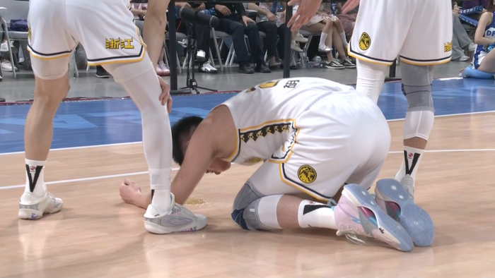 🙏😵胡金秋篮下卡位被撞痛苦倒地 趴在地板上呕吐不止