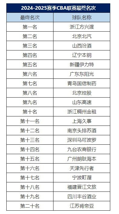 2024-2025赛季CBA联赛已于2025年5月20日圆满结束,现将2024-2025赛季CBA联赛最终名次公布。