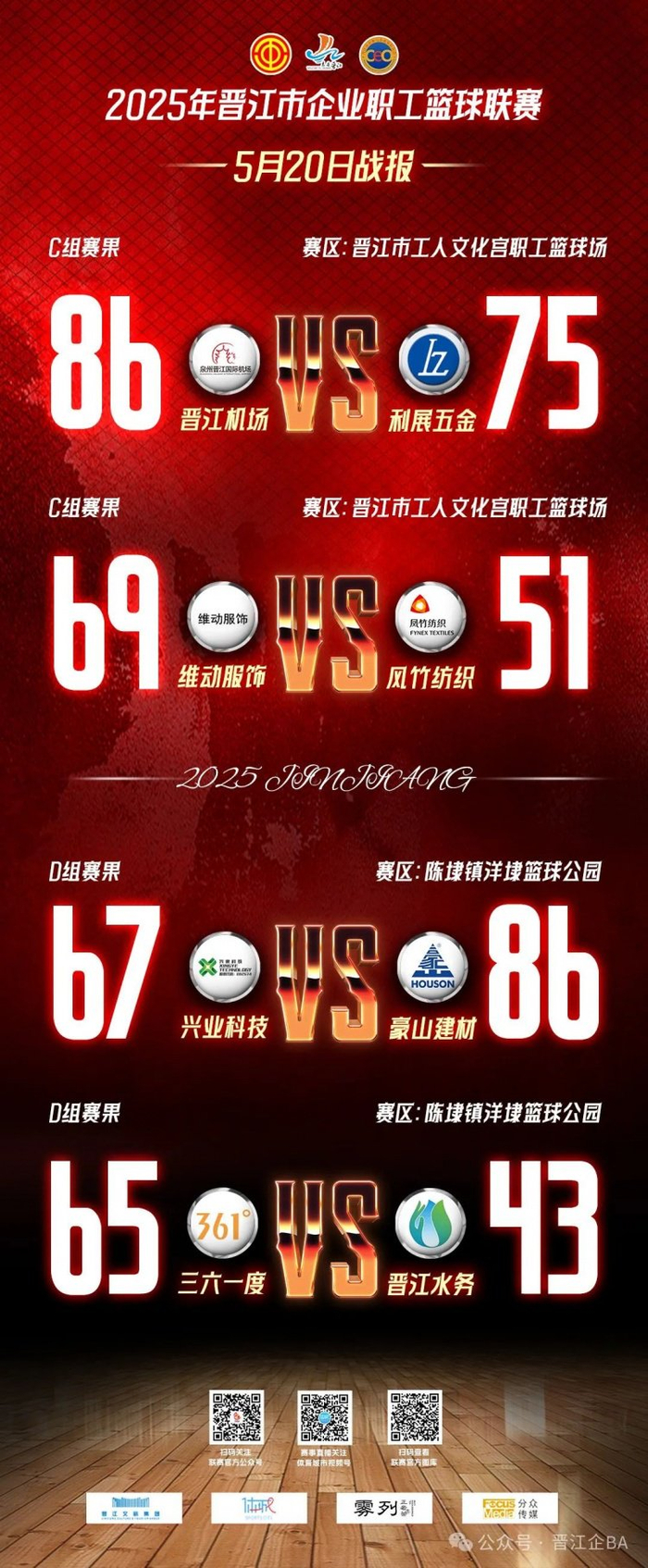 5月20日晚19:40,晋江企BA C、D组第一阶段小组赛在晋江市工人文化宫职工篮球场和陈埭镇洋埭篮球公园继续第五个比赛日的精彩对决。