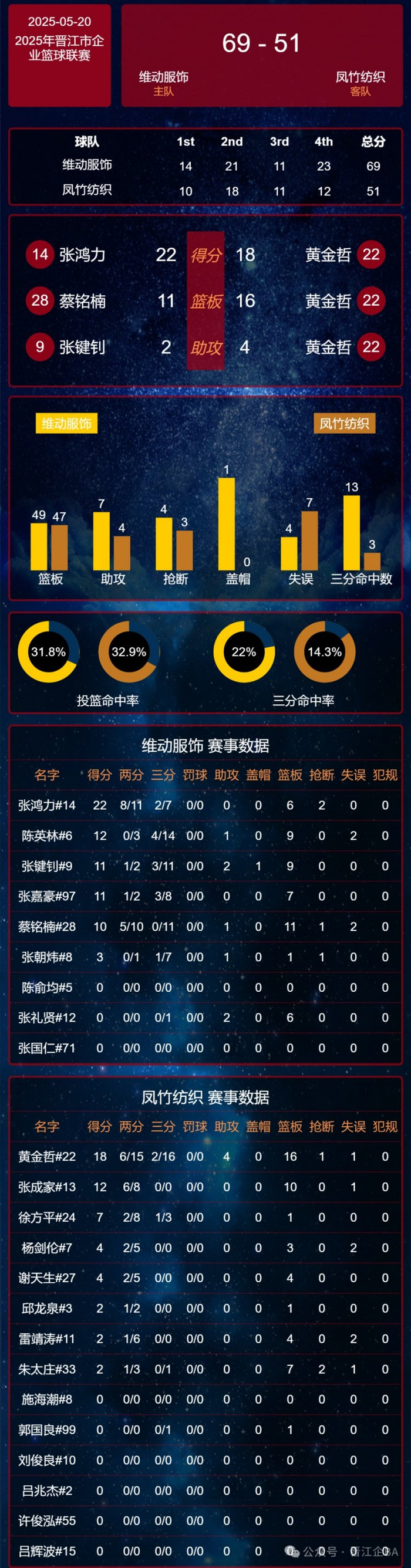 关键的第四节,凤竹纺织队全力反扑,试图挽回败局。他们加强了防守强度,同时在进攻端也更加果断。然而,维动服饰队并没有给对手太多机会。他们凭借出色的团队配合和稳定的发挥,始终掌控着场上的局势。在比赛的最后阶段,维动服饰队逐渐换上替补球员,让主力球员得到休息。尽管如此,他们依然保持着领先优势。最终,全场比赛结束,维动服饰队以 69:51 的比分战胜了凤竹纺织队。