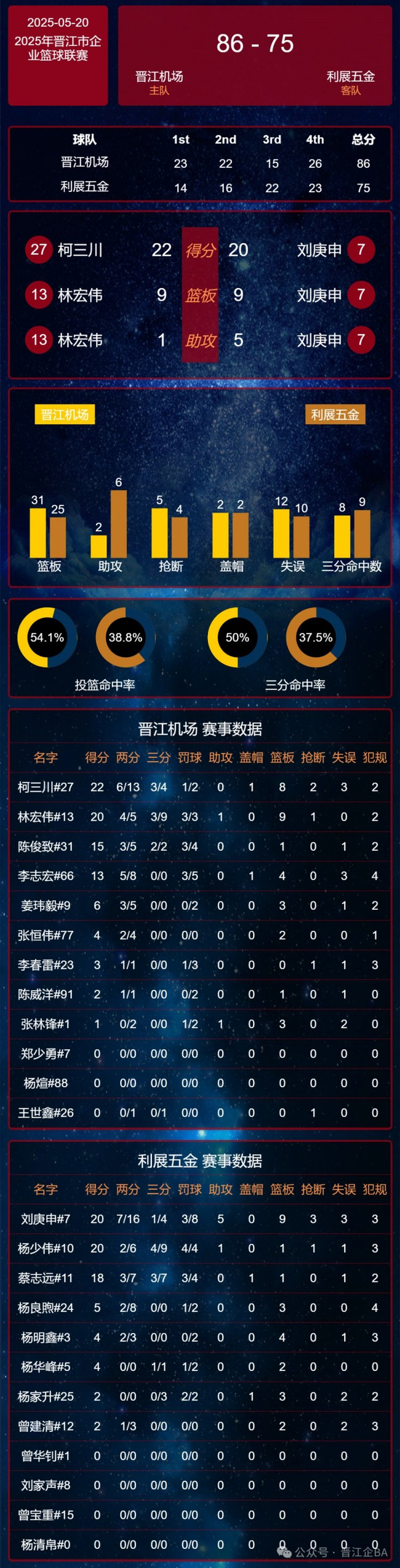 5月20日晚,C组晋江市工人文化宫赛区首场比赛由晋江机场对阵利展五金。尽管第三节开始,利展五金队东石镇老将刘庚申的带动下,逐渐找回状态,奋力一搏,但无奈之前比分差距较大,最终无力回天。全场比赛结束,晋江机场队以 86:75 的比分战胜了利展五金队。