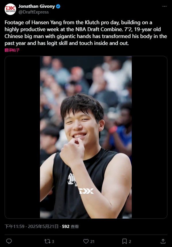 直播吧05月22日讯 今日,ESPN选秀专家Jonathan Givony单发一条推文介绍了杨瀚森在其经纪公司Klutch组织的ProDay训练日视频。