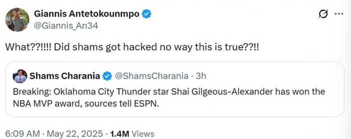 对此,字母哥转发评论道:“什么?!Shams的账号被黑了吗?这不可能是真的吧??!!”