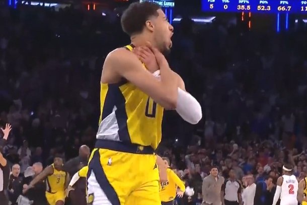 😈致敬传奇!哈利伯顿绝平之后 模仿雷吉-米勒锁喉送给纽约!