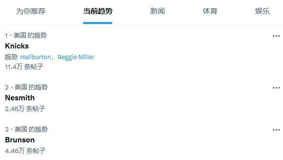 赛后,尼克斯冲上美国热搜第一,词条里还有哈利伯顿和雷吉-米勒。