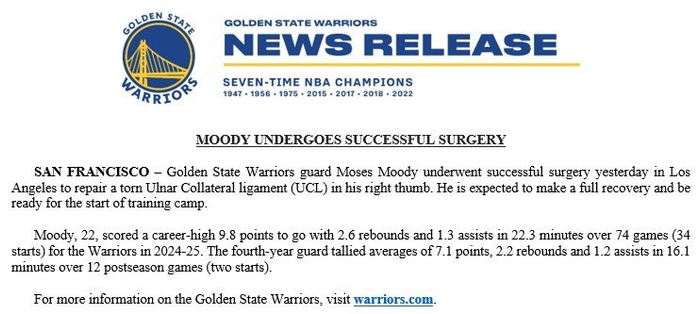 勇士官方:穆迪成功接受了右手拇指尺侧副韧带撕裂修复手术