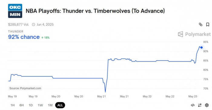 据数据媒体Polymarket Hoops实时统计,目前雷霆冲进总决赛的概率高达92%,森林狼只有8%。