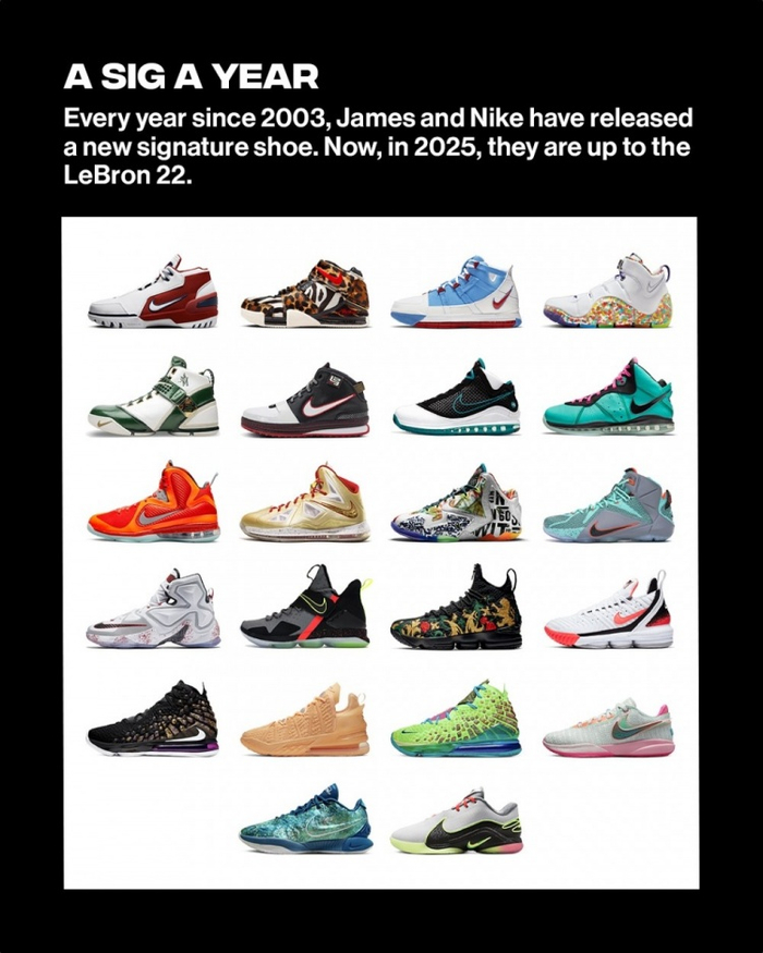 自2003年以来,詹姆斯与耐克每年都会推出一款新的签名球鞋。如今到了2025年,他们已经推出了勒布朗第22代战靴。