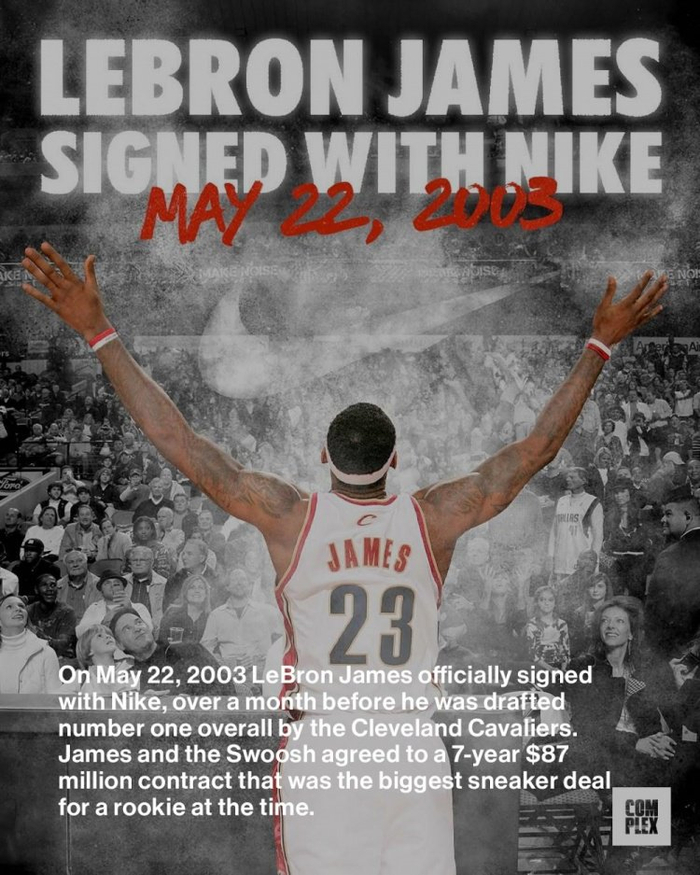2003年的今天,勒布朗-詹姆斯正式与耐克签下了7年8700万美元的合同,这在当时创下了新秀球员历史最大球鞋合同。在一天后的NBA选秀抽签大会上,克利夫兰骑士队抽得状元签,并在一个多月后的选秀大会中以第一顺位选中詹姆斯。