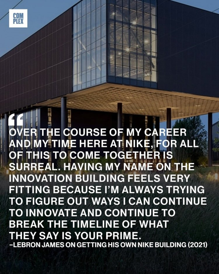 2021年10月,勒布朗-詹姆斯在耐克位于俄勒冈州比弗顿的全球总部拥有了以自己名字命名的大楼。这座占地75万平方英尺的空间内设有最新版本的耐克运动研究实验室,该实验室占地8.5万平方英尺,品牌在这里收集运动员的数据,用于产品设计。