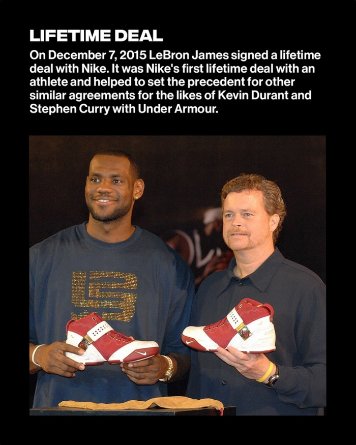 2015年12月7日,勒布朗-詹姆斯与耐克签署了一份终身合同。这是耐克首次与运动员签订终身合同,并为凯文-杜兰特与耐克和斯蒂芬-库里与安德玛的类似协议树立了先例。