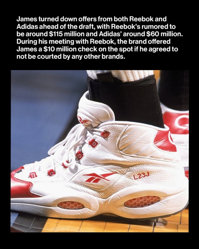 作为现象级的天才高中生球员,詹姆斯在选秀前拒绝了锐步和阿迪达斯的报价,其中锐步的报价据说约为1.15亿美元,而阿迪达斯的报价约为6000万美元。在与锐步会面时,该品牌的一位高管当场向詹姆斯提供了一张1000万美元的支票,条件是他不再与其他品牌接触。