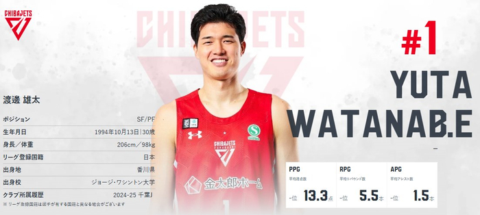 渡边本赛季从NBA回到日本B联赛,首个赛季他场均能拿到13.3分5.5篮板1.5助攻。不过,最近进行的半决赛,他所在的千叶喷射机不敌对手无缘决赛。